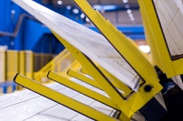 The different stacks of sections are therefore presented in the warehouse visualization in the form of coloured clusters. "This enables various lengths to be visualized very easily", explained Alexander Jung, a software developer at Falk. The conception went to such an extent that the storage jobs were initially simulated. "The virtual warehouse thinks in future terms and creates the possibility of calculating picking processes in advance." The aim here is to initially determine whether storage is possible at all and that before the storage and retrieval machine has received the corresponding travel commands. Falk has also developed a piece of animation software for the virtual warehouse so that it will be possible to quickly recognise the logistic processes which will take place at a later date. It displays the current occupancy of the warehouse and the movements of the storage and retrieval machine which has been designed by Falk. The idea behind this sophisticated system lies in the nature of a sectional door. They are normally individually installed, depending on the length and height. Whilst the cross cutter automatically specifies the section length at the end of the Kontilinie line from the job order, the later door size is determined by a combination of various section heights. These cannot however be manufactured simultaneously in a continuous production process, but when taking expensive retrofitting times into account, they are to be combined from various production batches. This results in an intermediate storage and an job-related picking.