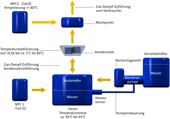 Examples are sensor calibration processes, welding processes, clean-room technology, fuel cells or the wide field of metal surface treatment. Due to its principle of operation, the compactly constructed system can also provide calibrated vapour densities for other liquids, not just water; specifically those liquids that have a comparable vapour pressure curve to water.