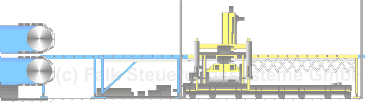 Es handelt sich bei diesem Anlagenteil um eine mitlaufende Bearbeitung mit Band- oder Kreissäge, die sich nach Ablauf der gewünschten Elementlänge exakt auf die Bandgeschwindigkeit aufsynchronisiert und dann einen Trennschnitt des Elementstranges vollzieht. Sollte ein manueller Eingriff erforderlich sein, können sogenannte Handschnitte ausgelöst werden. Hier wird in der Qualität der Handschnitte unterschieden, z.B. 2A Schnitt oder Schrottschnitt.