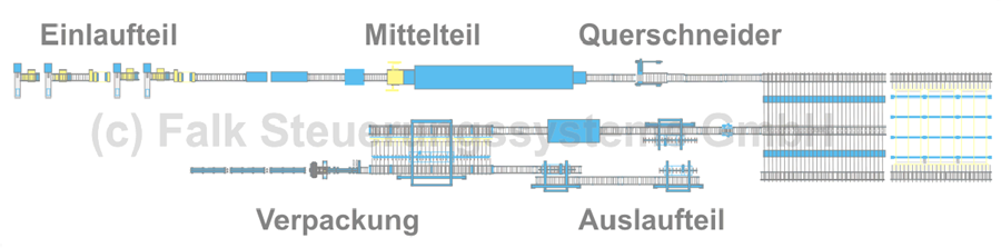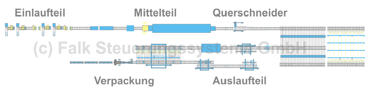 Diese Anlagen bestehen in der Regel aus einem Einlaufteil, Mittelteil, Querschneider, Auslaufteil und Verpackung.